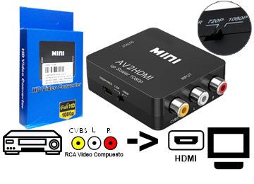 CONVERSOR RCA H a HDMI H – ADAPTADOR ENTRADA RCA SALIDA HDMI – NO ES BIDIRECCIONAL – CABLE MINIUSB NO INCLUYE TRANSFORMADOR 5V 2A